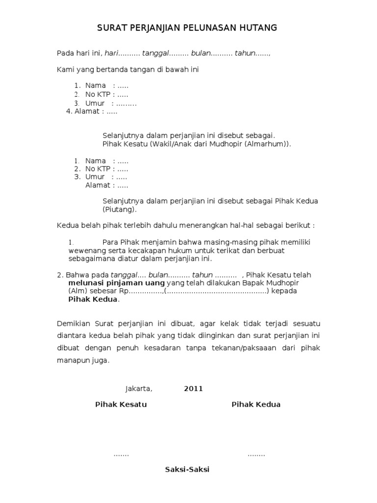Surat pernyataan dapat memberikan informasi pernyataan apapun termasuk didalamnya pernyataan kesanggupan membayar hutang. Contoh surat pernyataan kesanggupan membayar hutang dengan jaminan. Surat pernyataan hutang jaminan sertifikat rumah Contoh surat pernyataan kerja saya harap kamu sudah membaca artikel tentang pengertian macam dan bagian bagian dari surat pernyataan. Contoh surat pernyataan hutang perihal hutang piutang adalah hal yang sering kita temukan. Di bawah nanti kamu bisa lihat ada beberapa contohnya yaitu. Sebelum kami memberikan contoh surat pernyataan kesanggupan membayar hutang, kami ingin membahas sedikit tentang pengertian atau definisi hutang. Kesanggupan membayar spp & ukt; Surat pernyataan cicilan hutang jaminan motor. Contoh surat kesanggupan membayar hutang belajar office contoh surat pernyataan pembayaran hutang surat brosur buku contoh surat perjanjian hutang piutang Selain melihat pribadi yang meminjam kamu juga wajib untuk membuat surat pernyataan pembayaran cicilan hutang. Pekanbaru, riau dengan ini saya menyatakan kepada team surveyor. 15 contoh surat pernyataan kesanggupan untuk berbagai keperluan dalam berbagai kasus dan keperluan seseorang mungkin saja memerlukan dan harus menulis surat pernyataan.
