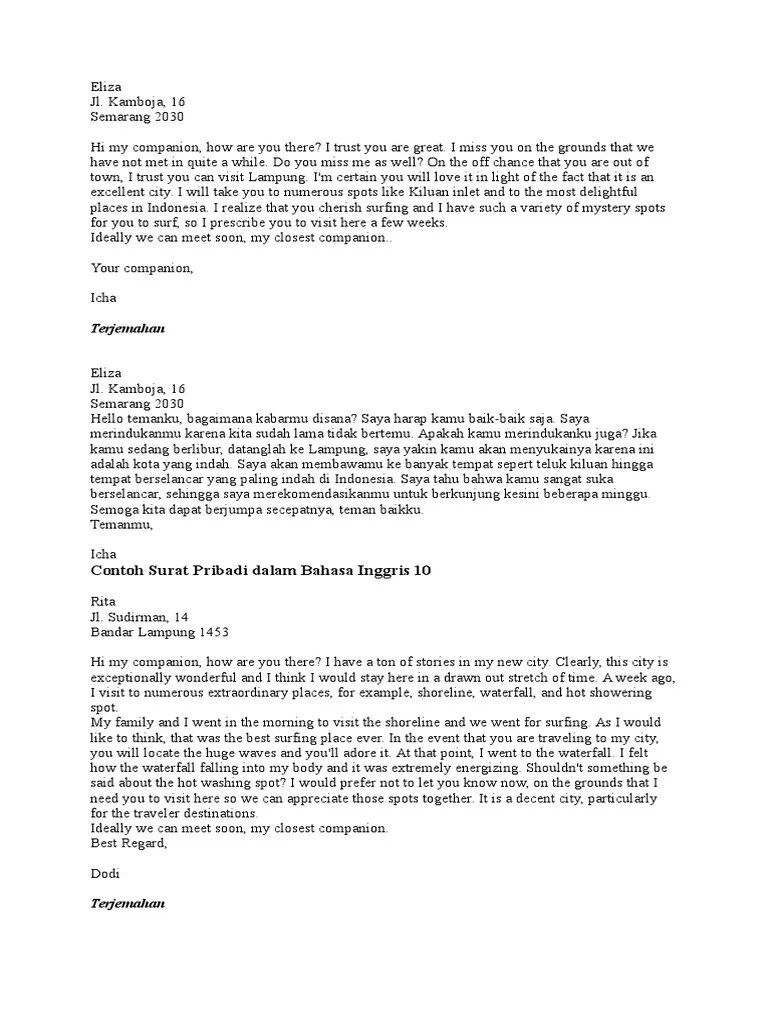 Contoh surat pribadi untuk teman contoh surat pribadi kepada teman tentang liburan. Bagimana sih ciri ciri surat peribadi dalam bahasa inggris ini, ya sama saja dengan yang ada dalam bahasa indonesia yang terpenting dari sisi bahasa yang membedakanya dengan surat lainya misalnya. Contoh surat untuk teman dalam bahasa inggris beserta artinya yang pendek. Download as docx, pdf, txt or read online from scribd. Demikianlah contoh surat bahasa inggris untuk teman yang bercerita tentang pengalaman liburan di bali.
