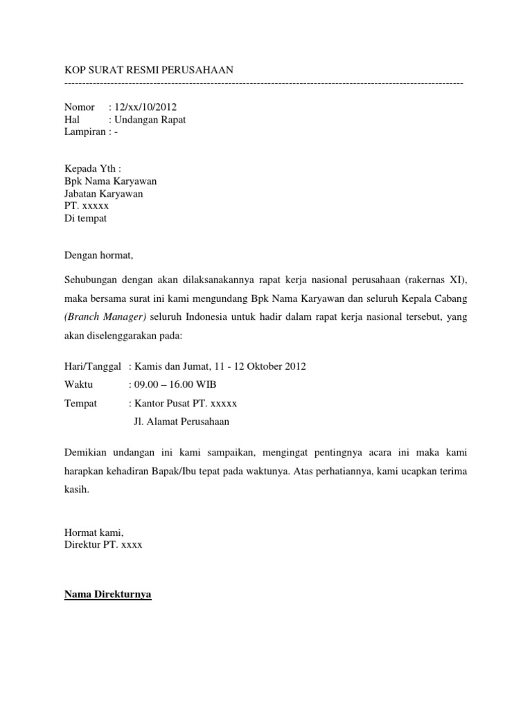 Nah, surat resmi biasa digunakan untuk tujuan acara yang resmi, sedangkan. Untuk itulah surat undangan rapat sangat diperlukan. Nah berikut ini jatikom akan berikan contoh surat rapat yang baik dan benar. Surat undangan rapat perusahaan dibuat ketika ingin mengadakan rapat yang ditujukan pada pihak yang dibutuhkan kehadirannya dalam rapat. Demikianlah undangan rapat kerja dan beberapa hal yang petlu dipersiapkan untuk dibawa serta.